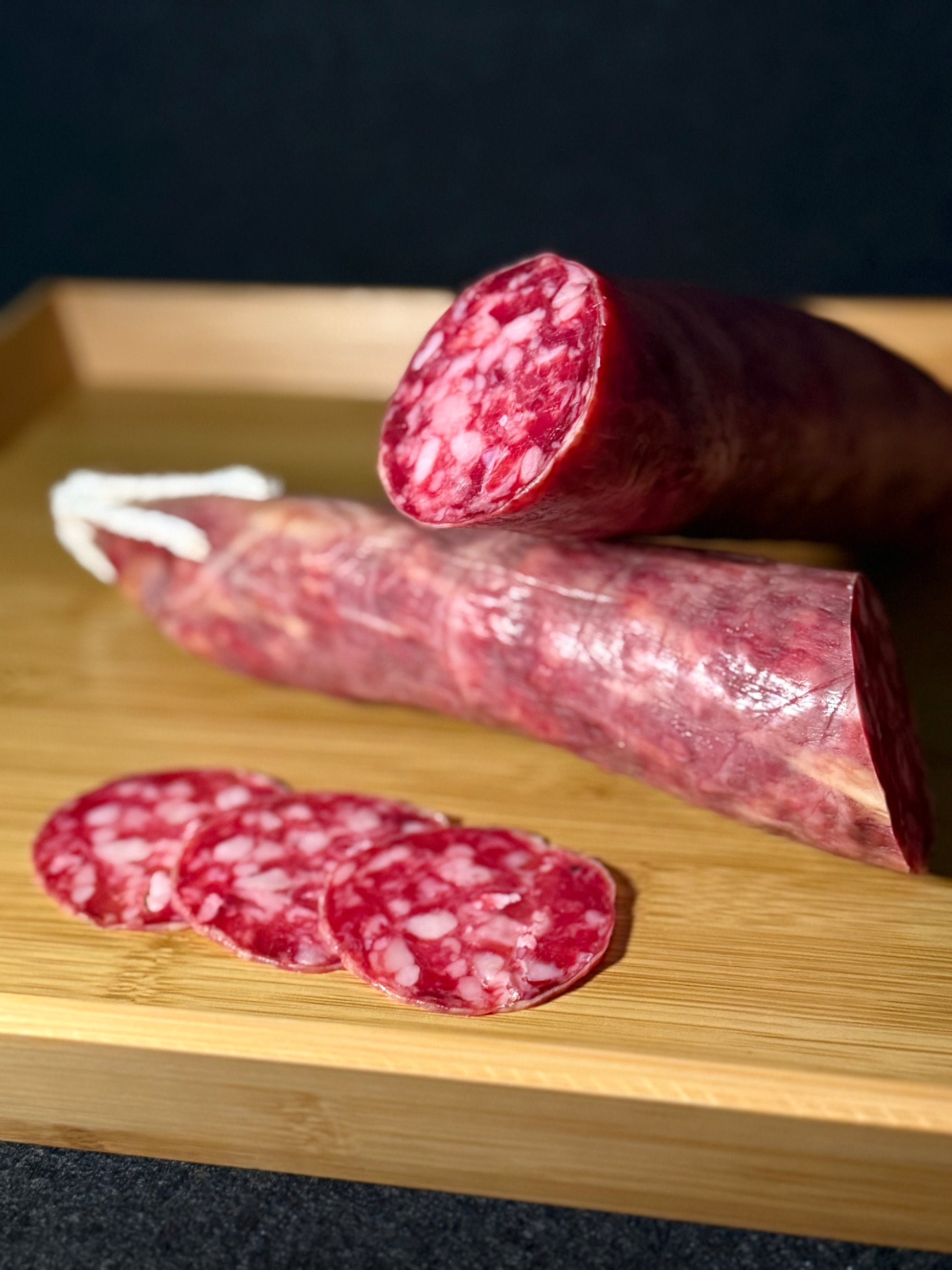 El Salchichón Ibérico Extra de Guijuelo es un embutido de categoría superior, elaborado con una cuidadosa selección de magros nobles de cerdo ibérico y aliñado con una mezcla equilibrada de especias y vino. Su origen en Guijuelo, cuna de los grandes ibéricos, aporta un sello distintivo de calidad y tradición que se aprecia en cada loncha.